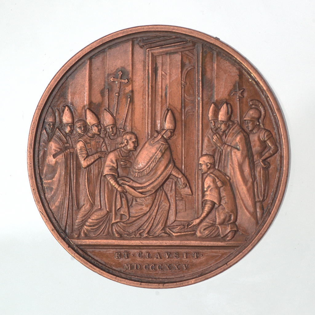 Alkalmi érem, amelyet 1825. december 24-én bocsátottak ki, a vatikáni Szent Kapu bezárásának alkalmából. Előlap: a pápa arcképe jobb profilból. Vállán hermelin-szegélyes mocétum és stóla, fején pileolus. Stólájának hímzésén a pápai jelképek, és a családi címer. Hátlap: a pápa palástban, és infulában, az asszisztencia segítségével elhelyezi a még teljesen nyitott kapuban az első téglát. Az ajtón keresztül látszik a bazilika belső tere.