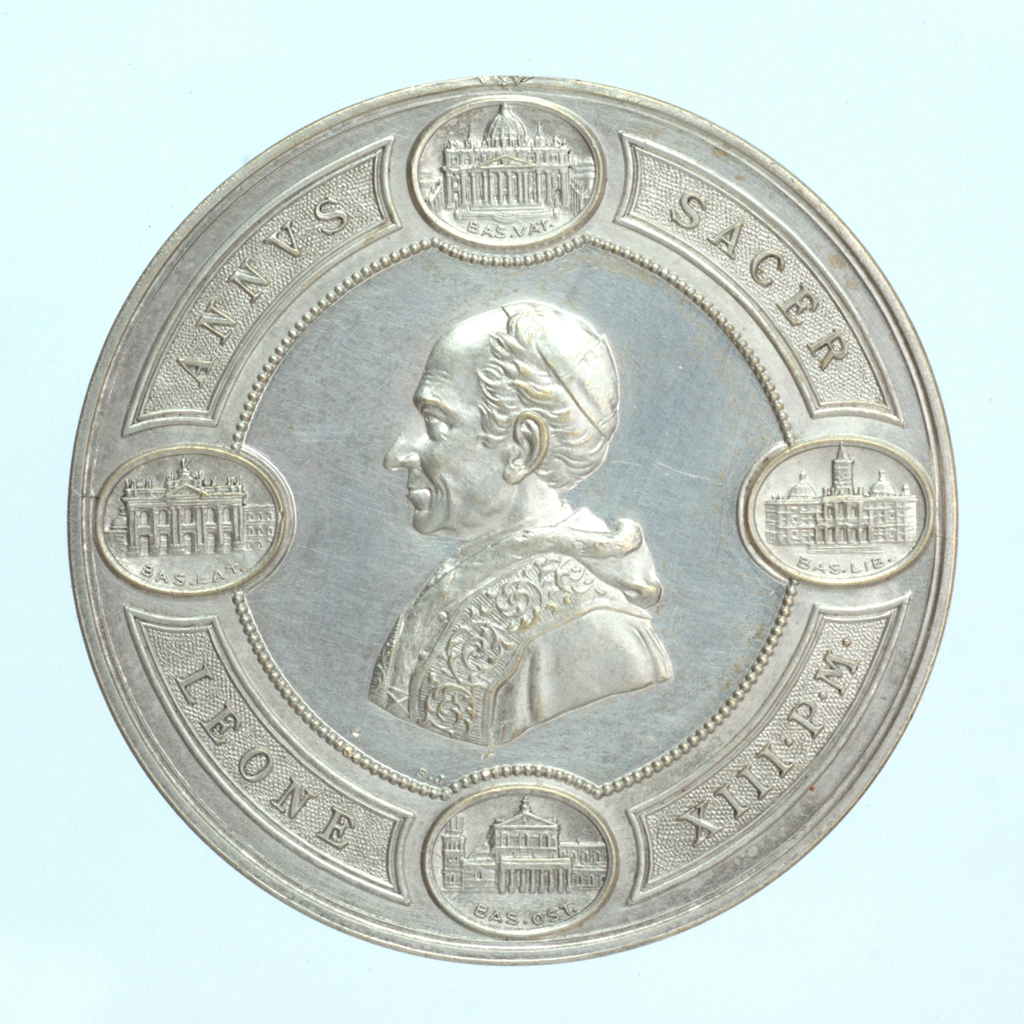 1900. évi jubileum emlékérme. Előlap: A gyűrűben a négy római partiarchális bazilika (Szent Péter, Lateráni, Santa Maria Maggiore, Falakon kívüli Szent Pál), homlokzati képe veszi körül a pápa arcképét. Hátlap: Sugárzó kereszt előtt, a felhőkön trónoló jobbjával áldást adó Krisztus, baljában kereszttel díszített országalmát tart. Lábánál két angyal kürtöli világgá a szentévet, egy angyal babérágat tart felhők között. XIII. Leo új évszázad első szentévét a Megváltó Krisztusnak (Krisztus királynak) szentelte.