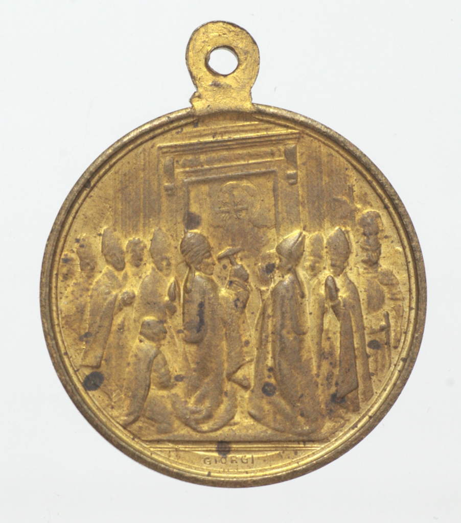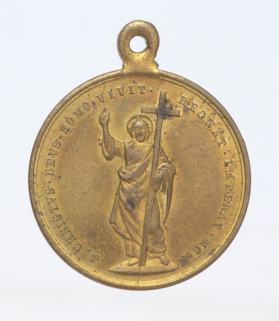 A szentév megnyitására kibocsátott, függő zarándok érem. Átfúrt fülön keresztül, zsinórra-bőrszálra fűzve, nyakba akasztva viselték. Előlap: Jézus Krisztus egész alakos képe, áldást osztó karja felemelve, baljában keresztet tart. A pápa kezdeményezte a megváltó Krisztus -az itt ábrázolthoz hasonló- szobrainak elhelyezését itáliai hegycsúcsokon. Felirat Jézus Krisztus Isten, Ember él uralkodik. Hátlap: a pápa főpapi ornátusban, a püspökök és a térdelő asszisztencia előtt kalapáccsal megüti a befalazott Szent Kaput. A fal közepén fénysugarakat árasztó latin kereszt.