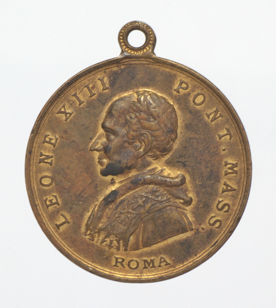 A Szentév tiszteletére kiadott, erősen kopott, zarándokérem. Az átfúrt fülön keresztül zsinórra-bőrszálra fűzve, nyakba akasztva viselték. Előlap: a pápa arcképe bal profilból. Vállán hermelinprém-szegélyes mocétum és stóla, fején pileolus. Felirat: XIII. Leó pápa Róma. Hátlap: a pápa, püspöki asszisztenciával, kezében kalapáccsal megüti a befalazott Szent Kapu közepén elhelyezett latin keresztet. Előtte diakónus térdel, kezében nyitott szertartáskönyv. Háttérben alabárdos gárdisták. Felirat: Szent Év Róma 1900
