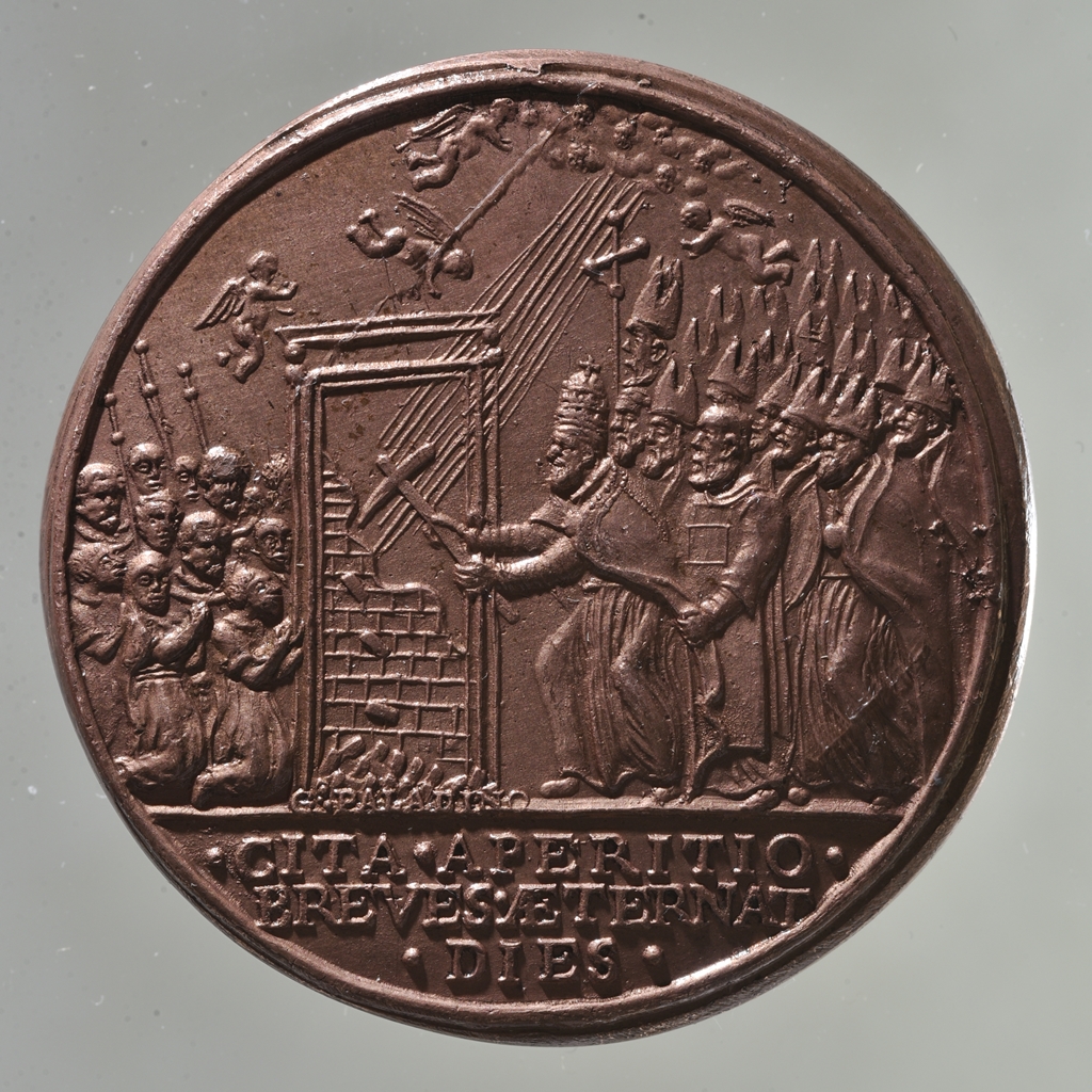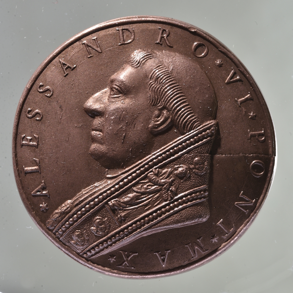 Restitúciós érem, amelyet 1664 körül készített, Girolamo Paladino, Francesco Barberini bíboros megbízásából, az 1500. évi Szentév emlékére. A pápa I499. március 28-án, nagycsütörtökön hirdette ki először „Urbi et Orbi", a „városnak és az egész világnak" a Szentévet elrendelő, Inter multiplices kezdetű bullát, amely Karácsony előestéjére állapította meg a Szentév megnyitását, és egyúttal minden más búcsút felfüggesztett. Az 1500-as Szentévben VI. Sándor pápa újra elrendelte és megerősítette a déli templomi harangozás gyakorlatát. Előlap: a pápa bal nézetű arcképe. Hátlap: a pápa az asszisztencia segítségével kibontja a Szent Kaput záró téglafalat. Balra térdelő zarándokok, háttérben püspökök sokasága. Fent négy kis angyal, felhőkből fénysugarak törnek elő a nyíló kapuba.