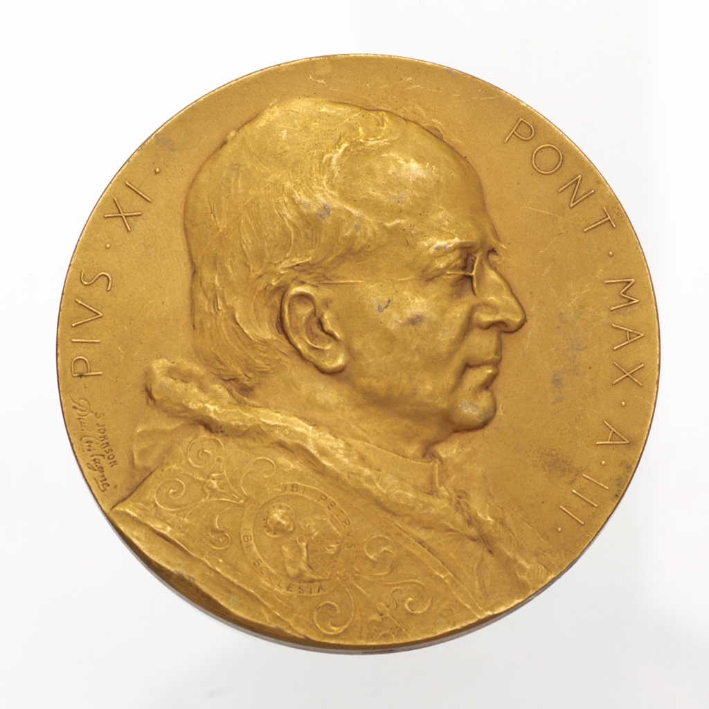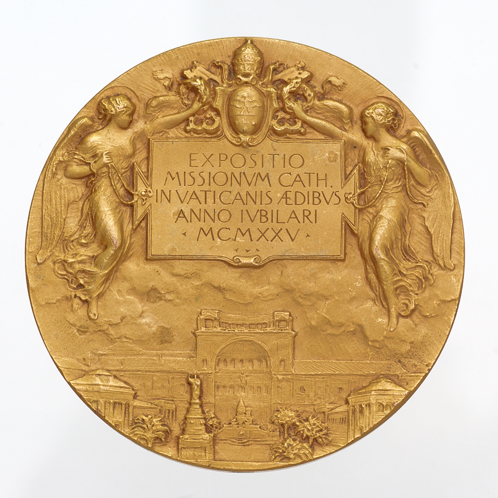 Alkalmi érem, amelyet a milánói Stefano Johnson gyár készített, matt háttérrel. Előlap: a pápa arcképe, jobb profilból, vállán mocétum, stólával. A stóláján Krisztus arcképét közrefogó, hímzett felirat: UBI PETRVS UBI ECCLESIA. Fején pileolus. Hátlap: A mező alsó részén a Cortile della Pigna – a Pigna udvar, a Vatikáni Múzeumok bejáratának kettős lépcsősorával, és az Agrippa fürdőjéből származó, bronz fenyőtoboz-szoborral. Fent két angyal tartja XI. Pius pápai címerét, a felhőkön nyugvó feliratos tábla fölé. Az éremkép XI. Pius által 1925-ben a Vatikánban rendezett Egyetemes Missziós Kiállításra utal.