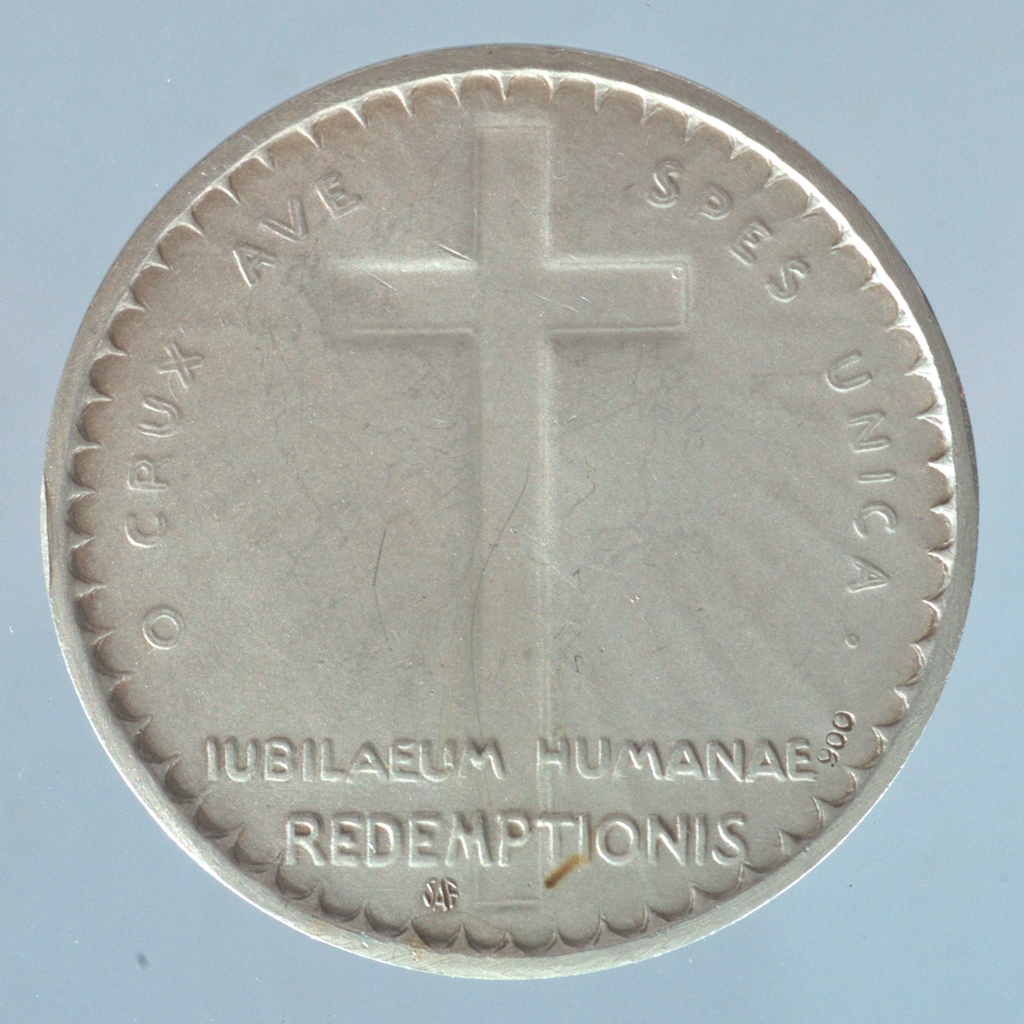 A Stabilimenti Artistici Fiorentini által 1933. 01. 04-én kibocsátott, matt hátterű alkalmi érem a Megváltás rendkívüli jubileumának emlékére. Előlap: a pápa arcképe jobb profilból, vállán palást, fején pileolus. A palást csatján pápai címerének motívumai. Hátlap: fogazott gyűrűben korpusz nélküli, álló kereszt.