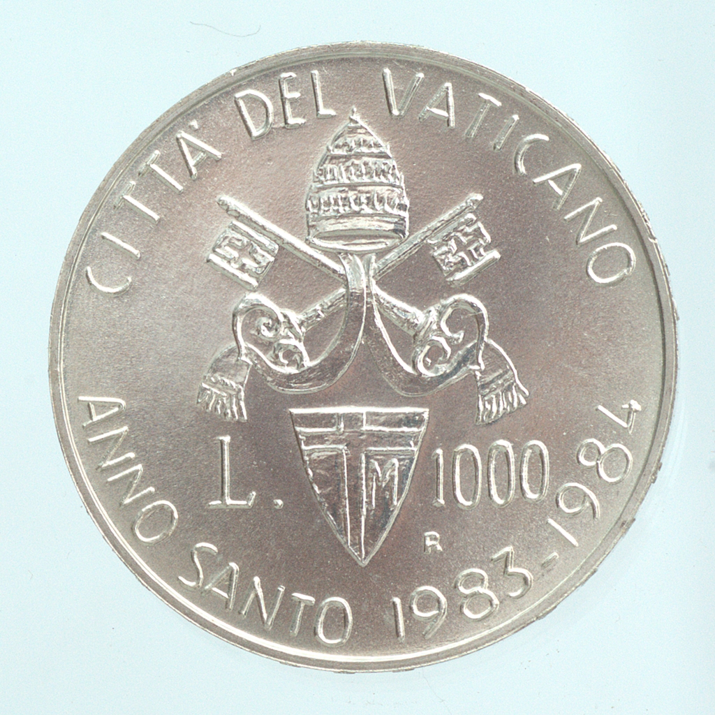 A jubileumi év alkalmából, az Istituto Poligrafico e Zecca dello Stato által kibocsátott 1000 lírás pénzérme. Előlap: a pápa bal profilú fél-alakja, áldást osztó pózban, kezében ferula ( püspöki pásztorbot helyett használt ezüst feszülettel), fején mitra. Hátlap: II. János Pál pápai címere, kétoldalt az érme forgalmi értékének megjelölésével. 2002-ben az érme demonetizálásra -azaz a pénzforgalomból kivonásra került az Euro bevezetésével.