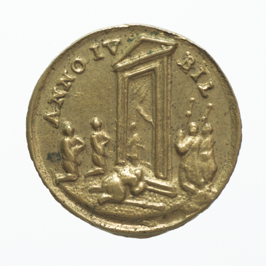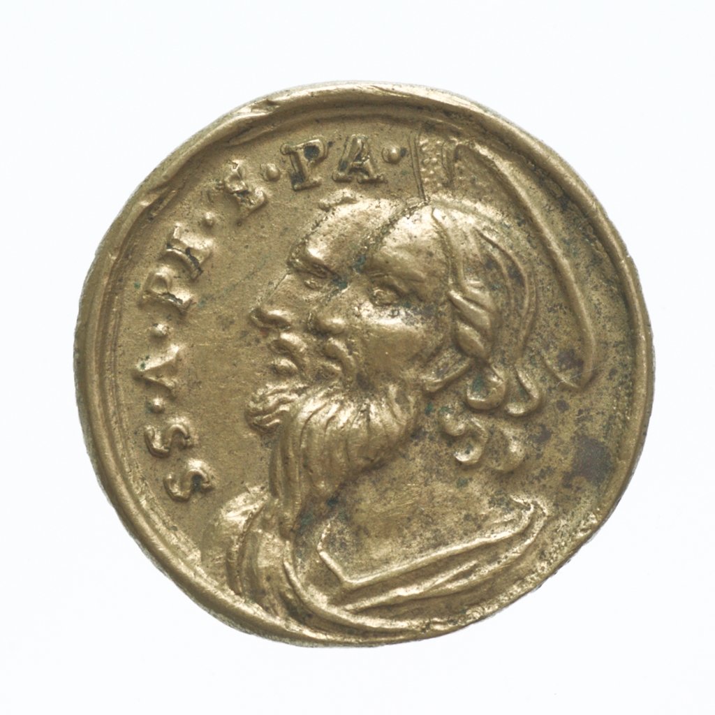 Kisméretű, ruhába varrható zarándokérem. Előlap: Szent Péter és Szent Pál apostolok bal profilú mellképe. Köriratban a főapostolok monogramja. Hátlap: a nyitott Szent Kapu előtt térdelő-imádkozó zarándokok. A körirat a szentévet jelöli évszám nélkül.