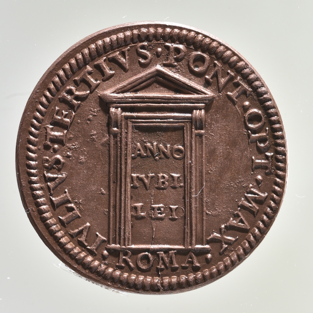Újravert, riconii-érem, a 16-17. században a Hamerani-műhely készítette, a 19. században pedig a Mazio-katalógusban jelent meg. Előlap: sodronymintás keretben a pápa arcképe, jobb profilból. Hátlap: sodronymintás keretben, a Szent Kapu zárt mezőjében, a jubileumot jelző felirat, datálás nélkül. Az évszámra csak a pápai portréból lehet következtetni.