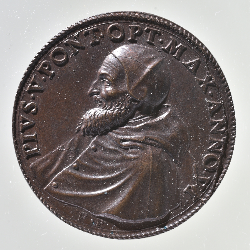 Az eredeti matricákkal a 17. században újra vert érem. Az eredetit, 1566-ban adtak ki, az Unio Christianorum (Keresztények Szövetsége) megalakulására bejelentett, rendkívüli Szentév alkalmából, amelyet a Cum gravissima bullával hirdetett ki a pápa. A szövetség létrehozásának célja volt a keresztény nemzetek összfogásának megteremtése, az Európát támadó, török hadsereggel szemben. A gyözedelmes, lepantói tengeri csata emlékére hálából alapította a Győzelmes Miasszonyunk ünnepét, melyet ma Rózsafüzér Királynője néven ismerünk. Előlap: a pápa arcképe, mocettában és camauróban, bal nézetből. Hátlap: Jézus áldást adva, fogadja a betegek, szegények, hontalanok könyörgéseit.