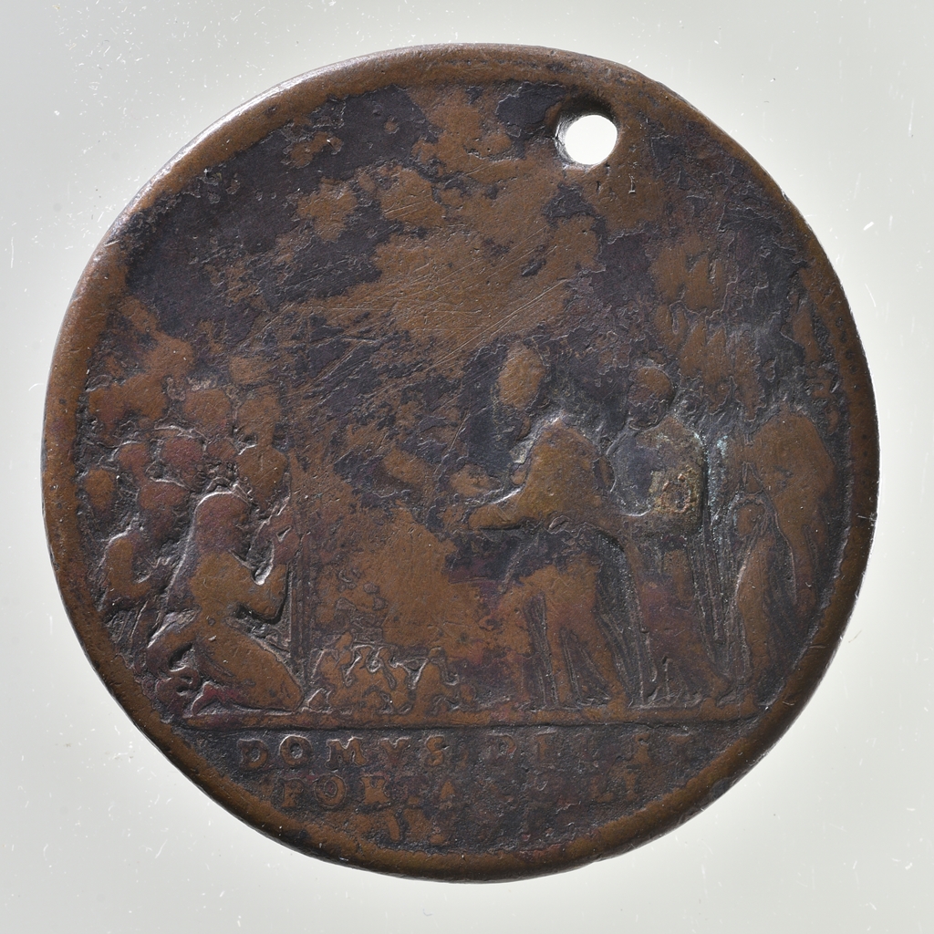 Erősen kopott, 1575-ben kibocsátott eredeti érem, amelyet a Szentév és a Szent Kapu 1574. december 24-i megnyitásának emlékére adtak ki. Egykori tulajdonosa árfúrta és hosszú ideig viselhette a testén. Előlap: a pápa arcképe bal profilból. Hátlap: a pápa az asszisztencia segítségével kibontja a Szent Kaput elzáró téglafalat, szemben térdelő zarándokok. Felirat: Istennek háza, mennyeknek kapuja.