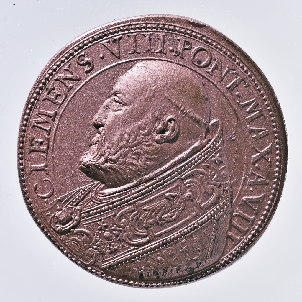 Újravert érem, amely a 19. században készült a római pénzverdében az 1600. évi szentév bejelentésének emlékére. A pápa 1599. május 19-én, Annus Domini piacabilis kezdetű bullájával hirdette meg a szentévet, és ő is nyitotta meg ugyanannak az évnek karácsony estéjén. Előlap: a pápa bal profilú arcképe, vállán ünnepi palást, amelynek széles gallérhímzésén vértanú apostol ábrázolása (Szent Péter?) látható. Hátlap: Pulpituson álló személy olvassa fel a pápai bullát. A pápa két kísérője között trónuson ülve hallgatja. Előtérben két kürtös hívja fel a figyelmet a bejelentésre.