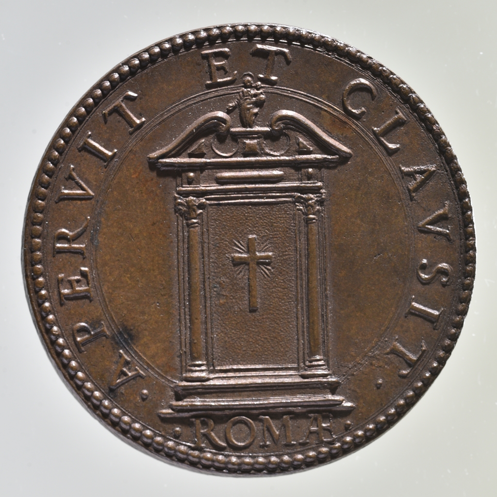 Riconii-újravert érem a Szent Kapu bezárásának emlékére. Anakronisztikus veret, a helyes datálás az AN•V helyett: AN•VII. Előlap: gyöngysoros keretben a pápa arcképe, jobb profilból, vállán palást. A palást vállszalagján a főpapi körmenet hímzett képe: püspökök, a pápai ernyőt (umbrella) hordozó diakónus, a Svájci Gárda alabárdosai, a pápa hordszéken (gestatoria), baldachin alatt, és ismét alabárdosok. A mellcsaton Szűz Mária a gyermek Jézussal. Hátlap: gyöngysoros keretben a bezárult Szent Kapu, közepén latin kereszt, sugárkoszorúban. A timpanon csúcsán Mária, a gyermek Jézussal.
