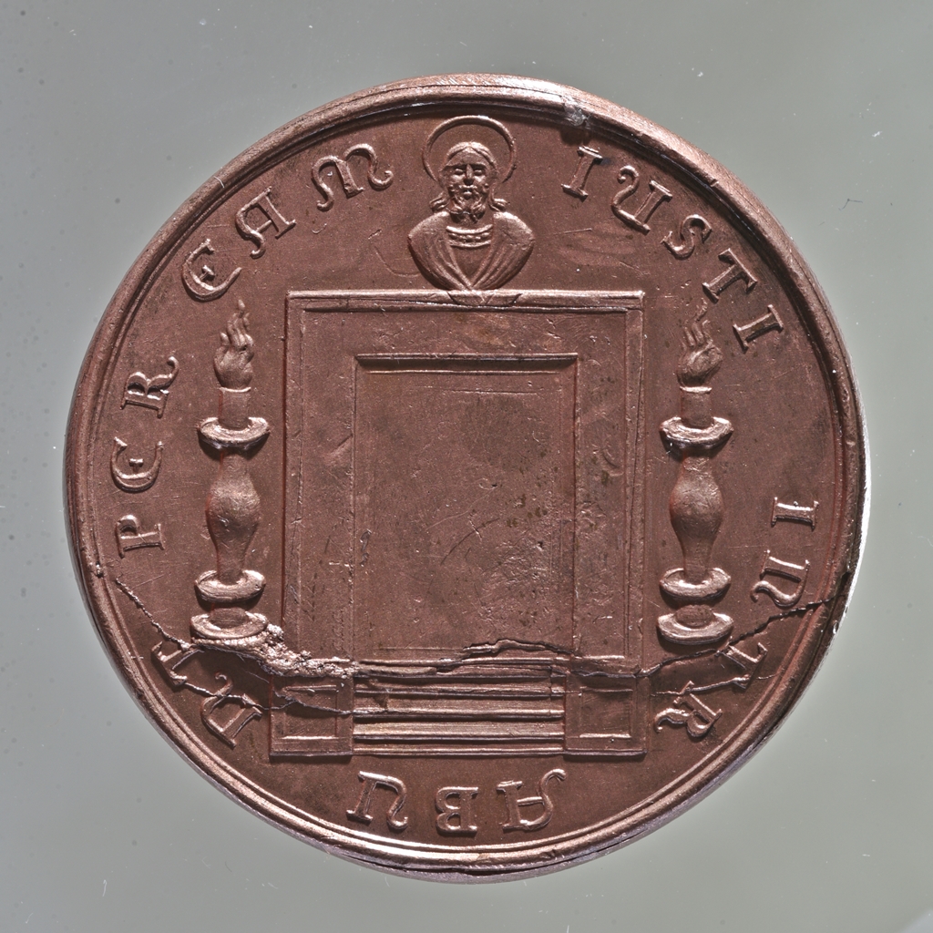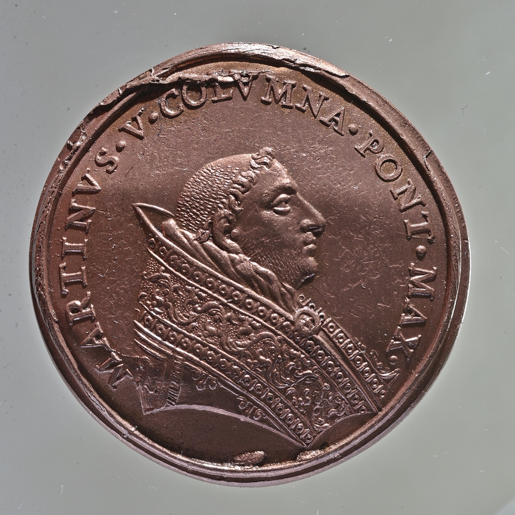 A 17. században vert restitúciós érem. V. Márton volt az első pápa, aki a lateráni Keresztelő Szent János bazilikában, kapu nyitásával indította el a jubileumi évet.