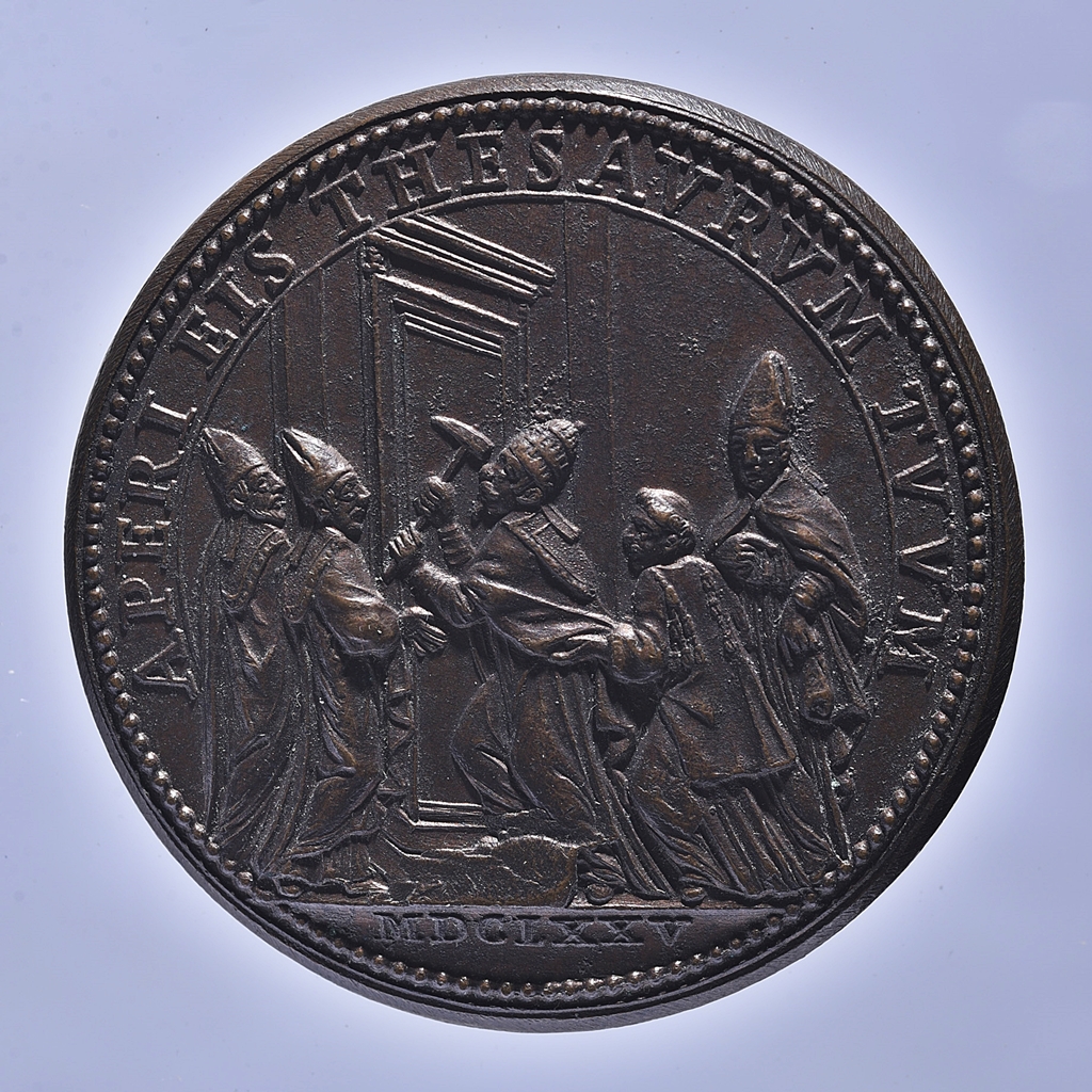 Hibrid, újravert-riconii érem, a Szent Kapu megnyitásáról. 1674. május 3-án hirdette ki a pápa az Ad Apostolicae vocis oraculum bullával a következő Szentévet. Előlap: gyöngysoros keretben a pápa arcképe jobb profilból. Vállán palást, fején tiara. Hátlap: egyszerűsített ábrázolása a Szent Kapu nyitásának gyöngysoros keretben. A pápa három püspök és egy diakónus kíséretében, csákánnyal áll a kapu előtt.