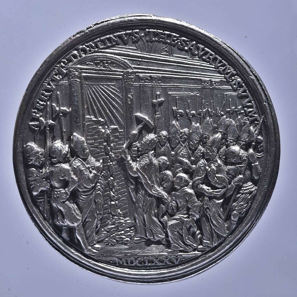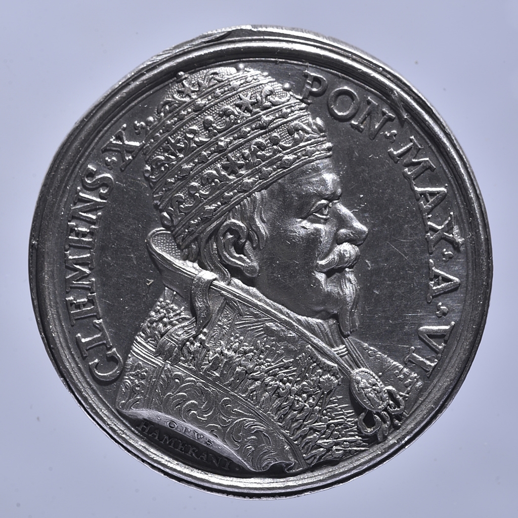 A Szent Kapu megnyitásának emlékére kiadott érem. 1674. május 3-án hirdette ki a pápa az Ad Apostolicae vocis oraculum kezdetű bullával a 15. szentévet. Elrendelte, hogy jubileumi szentév megnyitásának örömére, karácsony estéjét megelőző három napon, néhány óráig szóljon Róma minden harangja. Előlap: a pápa arcképe jobb profilból. Vállán palást, fején tiara. Palástja vállhímzésén a Szent Kapuhoz vonuló zarándokok végtelen sokasága között ő maga, a pápai hordszéken. A palást mellcsatján Szűz Mária alakja, a gyermek Jézussal. Hátlap: a pápa csákánnyal bontja a kapu záró falazatát, a téglák lába elé hullanak. A nyíláson fénysugarak törnek elő. Mögötte két térdelő diakónus és a püspöki asszisztencia. Balról a pápai testőrség, a svájci gárda alabárdos katonái.