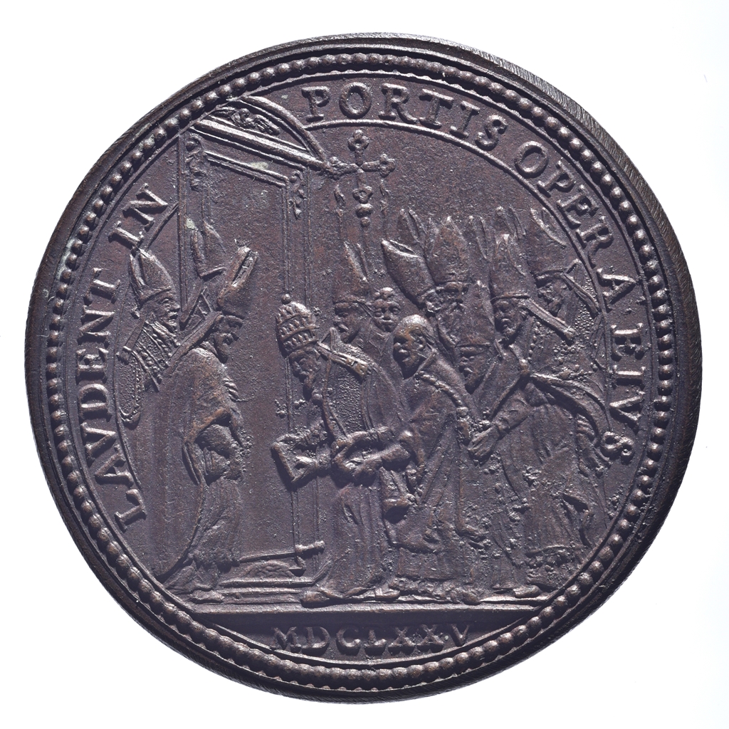 Hibrid, többször újravert-riconii érem, amelynek másolatait a 17. században Hamerani--műhely, a 19. században a Pontificia Zecca di Roma készítette. Az eredeti, rendkívüli érmet 1675. december 24-én adtak ki, a vatikáni Szent Kapu bezárásának emlékére. Előlap: gyöngysoros keretben a pápa jobb profilú mellszobra. Vállán pluviálé, fején tiara. A palást vállszalagjának hímzése: négy kis angyal által tartott, ovális kartusban a keresztre feszített Krisztus a Golgotán, alatta Mária és János apostol. Hátlap: gyöngysoros keretben a kapuzárás szertartása. A pápa palástban és tiarával a fején, elhelyezi a kapuban az első zárótéglát. Lábánál kőműveskanál. Előtte és mögötte az asszisztencia: püspökök és diakónusok. A körirat utal a Példabeszédek Könyve, 31. 31. fejezetére - "Magasztaljátok keze munkájáért, a városkapuknál dicsérjék tetteit!"