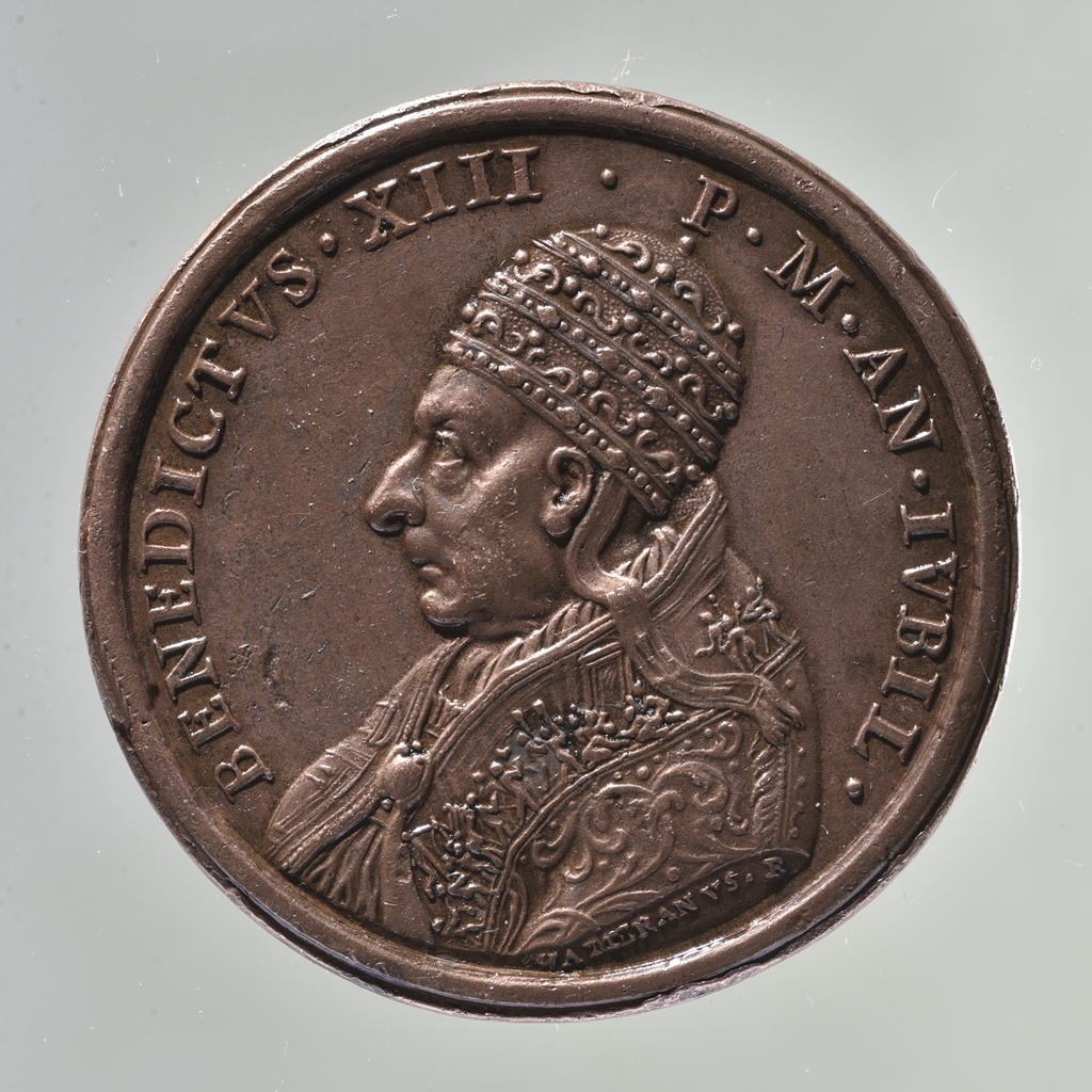 A Szent Kapu megnyitása. Rendkívüli érem, amelyet 1724. december 24-én bocsátottak ki, a vatikáni Szent Péter bazilika, Szent Kapu nyitásának emlékére. Előlap: A pápa arcképe bal profilból, vállán palást, fején tiara. A palást vállhímzése a Szent Kapu nyitási szertartását mutatja be. Hátlap: A pápa csákánnyal kibontja a Szent Kapu tégláit, amelyek a térdelő zarándokok elé hullanak. Térdelő diakónus tartja a pápa palástjának szélét, háttérben a püspöki kar, mögöttük az alabárdos Svájci Gárda testőrei. Fent, két kis angyal között fénysugarak árasztják el a bazilika belsejét a Szent Kapu megnyíló falrésén át. Az egyik angyal a mondatszalag feliratára mutat.