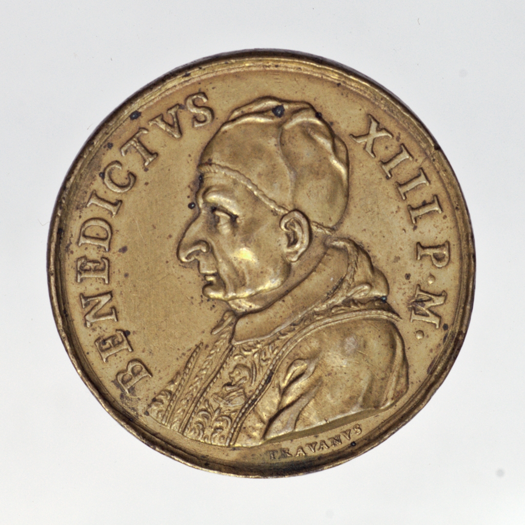 1724. június 26-án, a Redemptor et Dominus noster Jesus Christus pápai bulla kidásával megtörtént a Szentévet megnyitó ünnepség. Karácsony Szentestéjén a Szent Kapu megnyitása is. Előlap: a pápa arcképe bal profilból. Vállán mozetta és stóla, fején pileolus. Hátlap: a pápa vállán palást, fején tiara, kezében kalapács, mögötte a püspöki asszisztencia, és a pápai testőrség. Szemben térdelő, imádkozó zarándokok. A kibontott téglák a kapu elé hullanak, a nyitott résen fentről, sugaras fénycsóva jelenik meg.