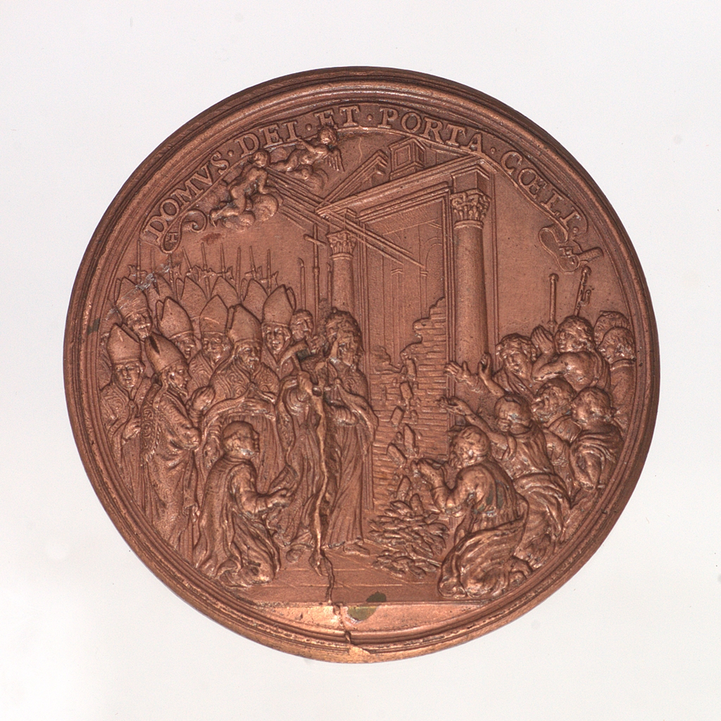 Alkalmi érem, amelyet a vatikáni Szent Péter bazilika, Szent Kapu nyitásának emlékére bocsátottak ki. Előlap: A pápa arcképe jobb profilból, vállán palást, fején tiara. Hátlap: A pápa csákánnyal kibontja a Szent Kapu tégláit, amelyek a térdelő zarándokok elé hullanak. Térdelő diakónus tartja a pápa palástjának szélét, háttérben a püspöki kar, mögöttük az alabárdos Svájci Gárda testőrei. Fent, két kis angyal között fénysugarak árasztják el a bazilika belsejét, a Szent Kapu megnyíló falrésén át. Az egyik angyal a mondatszalag feliratára mutat.