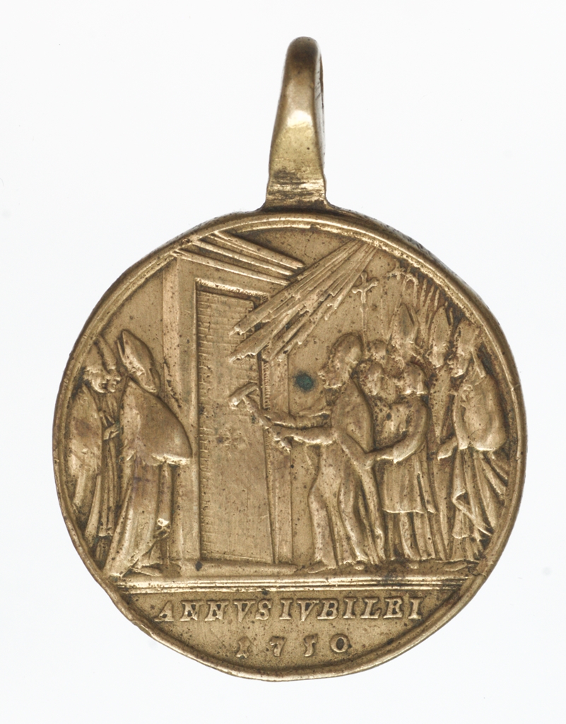 XIV. Benedek pápa pontifikátusa idején kiadott, jubileumi zarándokérem, az 1750-es Szentév és Szent Kapu megnyitásáról. Öntött, átfúrt fülön keresztül zsinórra-bőrszálra fűzve, nyakba akasztva viselték. Előlap: A pápa kalapácsával megüti a görög kereszttel jelölt, zárt téglafalat, a Szent Kapun. Előtte és mögötte az asszisztencia. Hátlap: Szent Péter és Szent Pál főapostolok egymással szembenéző mellképe.